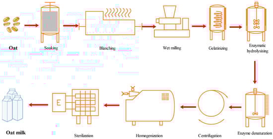 The manufacturing process is shown in Figure 1. Oats were blanched (95 °C, 5 min) after cleaning. Then, the samples were milled with six times as much water and kept at 95 °C for 10 min. Then, α-amylase (0.3 mL/100 g grains), glycosylase (0.5 mL/100 g grains), and β-glucanase (0.05 mL/100 g grains) were added to the samples. The samples were hydrolyzed at 100 °C for 1 h and then filtered through a 200-mesh cloth. Then, 1% of canola oil was added. The mixture was dispersed at 5000 rpm for 1 min, followed by two cycles of high-pressure homogenization at 45 MPa (Scientz-150, Ningbo Xinzhi Biotechnology Co., Ltd., Ningbo, China). Finally, the samples were sterilized for 5 s at 135 °C (HZ-SJJ, Shanghai Huizhan Experimental Equipment Co., Ltd., Shanghai, China).