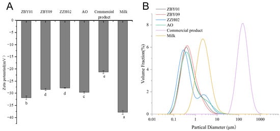 The ζ-potential (A) and particle size distribution (B) of commercial oat milk product, UHT bovine milk, and oat milk products produced from different cultivars. a,b,c,d,e, p < 0.05.