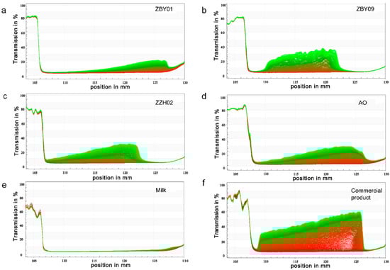 The stability of oat milk analyzed by using Lumisizer. (a), the stability of oat milk made of ZBY01; (b), the stability of oat milk made of ZBY09; (c), the stability of oat milk made of ZZH02; (d), the stability of oat milk made of AO; (e), the stability of UHT bovine milk; (f), the stability of commercial product. The red line in the bottom of each figure represents the first transmission record when the analysis started, the green line on the top of each figure represents the last transmission record during analysis.