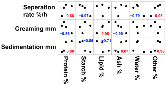 Correlation of nutritional composition of cultivars and physical stability of oat milk. The red number represents the positive correlation of the two parameters. The blue number represents the negative correlation of the two parameters.