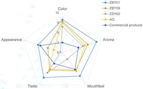 The sensory evaluation was conducted by 15 untrained panelists. They were asked to evaluate the color, aroma, taste, mouthfeel, and appearance of the four oat milk samples by employing a 10-point grading scale. Oat milk produced with ZBY01 had the best color, aroma, taste, mouthfeel, and appearance (Figure 5). Meanwhile, oat milk produced from ZZH02 had the lowest values of color, aroma, mouthfeel, and appearance. Oat milk derived from ZBY09 and AO had similar sensory properties, except for the appearance (Figure 5). The differences in the appearance of these two samples could be due to the visible sedimentation of AO. The overall acceptability of ZBY01 was the highest among the four samples. In the sensory evaluation of oat milk, flavor and appearance could influence the overall acceptability of the product [36,37] and need to be improved during oat milk production. The oat milk produced by us had a superior flavor and a slightly better appearance compared to the commercial product (Figure 5).