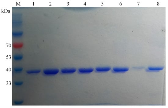 SDS-PAGE analysis of DLFae4 and variants. lane 1, purified DLFae4 protein; lane 2, purified variant DLFae4-m1 protein; lane 3, purified variant DLFae4-m2 protein; lane 4, purified variant DLFae4-m3 protein; lane 5, purified variant DLFae4-m4 protein; lane 6, purified variant DLFae4-m5 protein; lane 7, null; lane 8, purified variant DLFae4 (A341G) protein; lane M, standard protein marker.