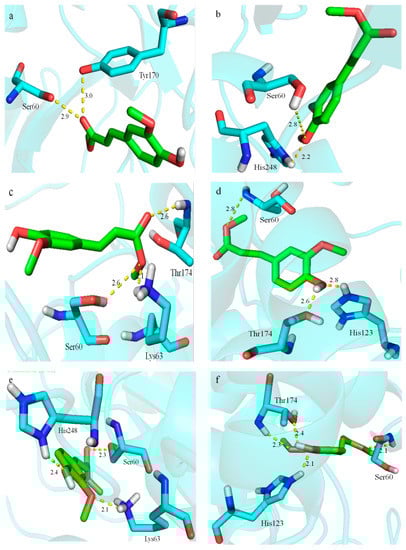 The hydrogen bond interaction between the active site of the enzyme and MFA. (a): DLFae4; (b): DLFae4-m1; (c): DLFae4-m2; (d): DLFae4-m3; (e): DLFae4-m4; (f): DLFae4-m5. The substrate MFA is represented by a green stick pattern, the amino acid residues that form hydrogen bonds with MFA are represented by a cyan stick pattern, and the hydrogen bonds are represented by a yellow dashed line.