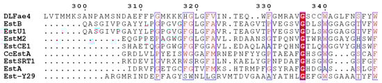 Multiple sequence alignment of DLFae4 and other closely related VIII family esterases.