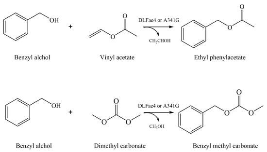 In order to test the acyltransferase activity of DLFae4 and variant DLFae4 (A341G), reactions for benzyl acetate formation contained purified DLFae4 or variant DLFae4 (A341G) (0.1 mg/mL), 50 mM benzyl alcohol, and 200 mM vinyl acetate in 1 mL of 200 mM potassium phosphate buffer (pH 8.0). Time samples (50 µL) were taken after 5, 10, 15, 20, 25, 30, 40, 60, 90, 130, and 180 min. Reactions for benzyl methyl carbonate formation contained purified enzyme, 20 mM benzyl alcohol, and 200 mM dimethyl carbonate in 1 mL of 200 mM potassium phosphate buffer (pH 8.0). Time samples (50 µL) were taken after 5, 10, 15, 20, 25, 30, 40, 60, 90, 130, 180, 240, and 480 min. The pretreatment of samples and GC-MS analysis were the same as the description above.