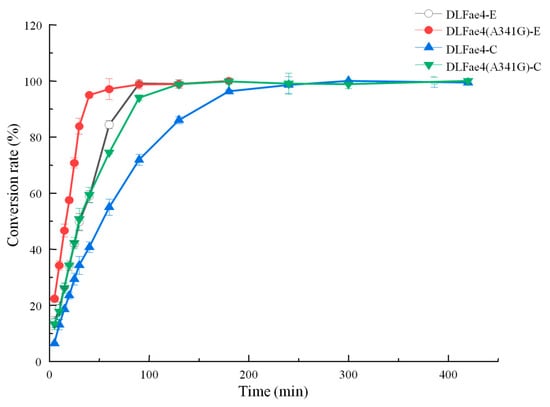 DLFae4 and A341G catalyze the synthesis of benzyl acetate (circle) and benzyl methyl carbonate (triangle) in phosphate buffer. DLFae4-E: the conversion of benzyl acetate by DLFae4, DLFae4 (A341G)-E: the conversion of benzyl acetate by variant DLFae4 (A341G), DLFae4-C: the conversion of benzyl methyl carbonate by DLFae4, DLFae4 (A341G)-C: the conversion of benzyl methyl carbonate by variant DLFae4 (A341G). Note: All assays were performed in triplicate, and the values shown are mean ± standard deviation.