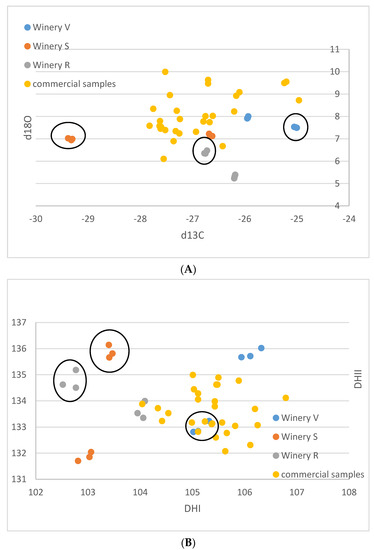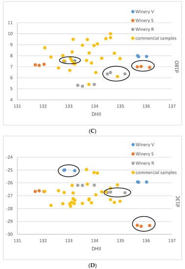 These samples are very heterogenous, as they come from six different localities of three different wineries and two different cultivars. Thus, any pattern recognized might be entirely coincidental. However, assuming that the samples from an individual winery were irrigated with similar water with respect to the isotope ratio, and experienced similar weather conditions, the following might be a valid interpretation of the observed data: The small-scale vinification samples show distinctive patterns, which enable a differentiation by the wineries. The samples from winery V are notably higher in δ18O than the other two wineries and show higher δ13C and (D/H)I(D/H) values. The samples from winery S lie in the middle, and the samples from winery R have the lowest δ18O-values. The δ13C-values of the wineries S and V are relatively similar—except that one of the triplicates of winery S shows exceptionally low δ13C-values below −29‰. Based on the available data, a complete differentiation of the investigated samples by wineries is possible, based on the differing δ18O values. However, one must keep in mind that the data are very limited, and more samples per winery might lead to overlapping values.