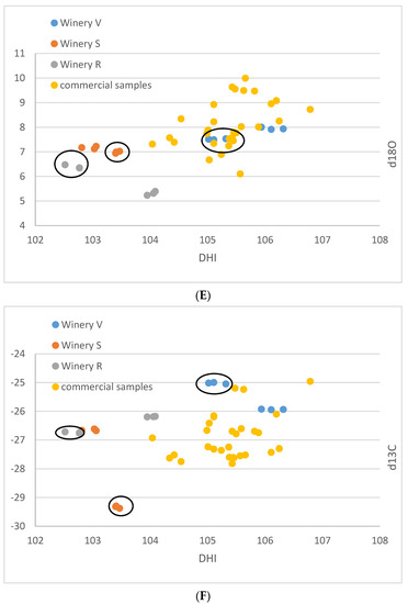For the small-scale vinifications from the Stellenbosch area, the δ13C-values range between −29.4 and −25.0‰, and the δ18O-values vary between 5.2 and 8.0‰ (Table 1). The (D/H)I values are between 102.5 and 106.3 ppm, and (D/H)II between 131.7 and 136.0 ppm (Figure 1A–F). The commercial wine samples possess δ13C values between −27.8 and −25.0‰, and δ18O values from 6.1 to 10.0‰. (D/H)I ranged from 104.0 to 106.8 ppm, and (D/H)II from 132.0 to 135.0 ppm.