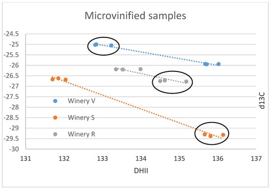 Individual wineries’ small-scale samples δ13C versus (D/H)II results in ‰ versus V-PDB for δ13C and in ppm for (D/H)II. The results of all three wineries investigated are negatively correlated. Ellipses identify the Sauvignon Blanc from the Chenin samples of the small-scale samples of the wineries R, S, V.