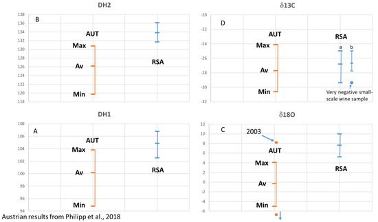 (A–D) South African (RSA) wine isotope results versus Austrian (AUT) wine isotope results for vintages 1997–2004. All values are reported in ‰ versus V-PDB for δ13C, in ‰ versus V-SMOW for δ18O, and in ppm for (D/H)I and (D/H)II. Austrian results from Philipp et al., 2018 [9]. (C): “2003” marks the Austrian sample from vintage 2003 with a very high δ18O-value. An Austrian sample with a very low δ18O value below −6‰ is a “dry-berry”-sample. (D): South African results are presented as bar (a) including all samples, and bar (b) showing separately the depleted values of small-scale samples of Sauvignon Blanc from winery S.