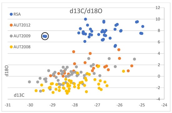 South African wine δ13C- and δ18O-isotope results and Austrian wine isotope results vintages 2008, 2009 (Horacek et al., 2021 [20]) and 2012 (Griboff et al., 2021 [31]). Values are shown in ‰ versus V-PDB for δ13C, and in ‰ versus V-SMOW for δ18O. Black circle denotes the South African small-scale vinification sample showing exceptionally low δ13C-values. For further explanations refer to text.
