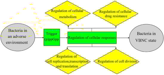 The stringent response is a key survival mechanism often used by bacteria in response to adverse environmental conditions [37], which is elicited through the synthesis of a small-molecule alarmone (guanosine pentaphosphate; (p)ppGpp). (p)ppGpp is a typical alarm factor responsible for sensing environmental stresses and triggering a stringent response. Accordingly, (p)ppGpp re-intervenes the cellular response machinery, inducing a downstream pathway to drive the bacteria into a dormant state. Bacterial (p)ppGpp regulates replication, transcription, and translation, and affects bacterial physiological states through binding to several cellular targets (e.g., RNA polymerase) and through regulatory pathways related to metabolism, cell division, and antibiotic resistance. (p)ppGpp-mediated stringent responses may play an important role in the entry of bacteria into the VBNC state (Figure 2) [38,39]. The synthesis and hydrolysis of (p)ppGpp depend on the activity of two proteins, RelA and SpoT. Elevated activity of the relA and spoT genes upon entry into the VBNC state leads to the accumulation of (p)ppGpp, resulting in the enhancement of stress resistance [40].