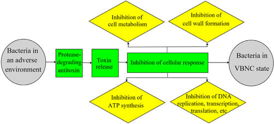Bacteria are characterized by a complex of stable toxin proteins that slow bacterial growth or directly mediate bacterial death, and unstable antitoxin proteins that inhibit the expression of toxin proteins. The proteins are controlled by plasmid- or chromosome-encoded TA genes [41]. The TA system is activated when bacteria are exposed to adverse external environmental stresses. The system uses the differential expression of TA to regulate bacterial self-screening for survival adaptation. This is evidenced by the fact that unstable antitoxins are degraded by proteases, while the simultaneous expression of toxin proteins regulates the reduction of metabolic turnover by inhibiting essential cellular processes, such as DNA replication, translation, protein synthesis, ATP synthesis, and cell wall formation, causing the cell to enter a VBNC dormant state [41,42]. The expression levels of genes related to the TA trigger system (rpoS, spoT, relA, ppx, ppk, and lon) as well as the antitoxin proteases Lon and ClpP are upregulated in bacteria after induction of the VBNC state upon exposure to an adverse environment (Figure 3) [43,44].