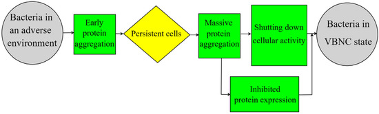 Bacteria can become persistent cells, which is defined as a dormant, non-dividing, and metabolically inactive state. Indeed, bacteria in the VBNC could be considered as a deeper level of dormancy. Since persistent and VBNC cells are very similar in their dormancy and tolerance of high antibiotic concentrations, the increasingly accepted view is that persistent and VBNC cells might represent different stages of the same dormancy process [51]. During this process, the appearance and increase in protein aggregates correlate with bacterial persistence [52]. This has prompted investigations of the role of protein aggregation in the dynamic transition of bacteria from the persistent to the VBNC state. Induction of protein aggregation was observed as bacteria progressively entered dormancy, with persistent cells starting to produce protein aggregates at an early stage and VBNC cells harboring more mature protein aggregates (Figure 4) [53,54]. Since the aggregates contained many proteins required for translation, researchers have also theorized that the massive aggregation of these proteins shuts down cellular translational activity and thus induces dormancy. Furthermore, researchers have also found that the expression of Obge, a persistent protein that interacts with ribosomes, could exacerbate protein aggregation and facilitate the transition to the dormant state. These findings coincide with the results of Anusuya et al. [55] on the proteomic characterization of VBNC and recovered V. cholerae, where 19 proteins related to carbohydrate metabolism, phosphate utilization, and stress response appeared to be highly expressed when bacteria recovered from the dormant state.