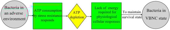 The mechanism of bacterial entry into VBNC involves complex processes which cannot be separated from the regulation of genes. RNA sequencing (RNA-Seq) transcriptomics and isobaric tag for relative and absolute quantitation (iTRAQ) proteomic methods have been used to compare transcriptional and protein expression differences in E. coli O157:H7 in the normal and VBNC states. The authors identified 97 genes and 56 proteins that were significantly altered upon entry into the VBNC state, which mainly involved genes and proteins related to membrane transport, metabolism, DNA replication, and cell division, and which led the cells to the VBNC state of low metabolic activity [49]. Similarly, genomic characterization of VBNC V. cholerae revealed changes in the expression of 1420 genes, with upregulation of genes related to biofilm formation and stress response, and downregulation of genes related to cell division and ribosome activity [50]. A total of 16 genes were significantly upregulated when E. coli was in the VBNC state, including stress response-induced genes, three genes encoding toxic proteins (ygeG, ibsD, and shoB), and others [17]. Taken together, the gene expression analysis provided novel insight into the regulation mechanisms of bacteria entering into the VBNC state when exposed to a harsh environment.