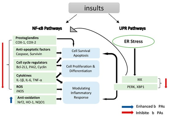 NF-κB target genes implicated in the onset and progression of inflammation. NF-κB is a transcription factor that is inducible. After activation, it can regulate inflammation by activating the transcription of several genes. NF-κB regulates cell proliferation, apoptosis and differentiation in addition to promoting the production of pro-inflammatory cytokines and chemokines. Endoplasmic reticulum (ER) stress results in an inflammatory unfolded protein response (UPR). Stress on the ER induces apoptosis by activating inflammation. This can be accomplished by stimulating IKK complex (element of the NF-κB) or (X-box binding protein 1) XBP1 and (protein kinase R-like ER kinase) PERK through a mediator. These trigger the release of pro-inflammatory molecules, hence accelerating cell death.