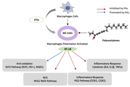 Schematic representation of the possible mechanism of immunoregulation activity of poly-acetylenes (PAs) in macrophages. (Interferon-γ) IFN-γ activates macrophage cells to M1, and PAs downregulate NF-κB activities in M1 macrophages by inhibiting iNOS, COX-1 and COX-2. PAs suppress the inflammatory response by inhibiting cytokines (IL-16, IL-1β and TNF-α) and upregulating Nrf2 pathway (HO-1 and NQO1) in macrophages. PAs structure modified from Mplanine (2022) https://www.wikiwand.com/en/Falcarinol#Media/File:Falcarinol_3D_BS.png (accessed on 1 January 2023).