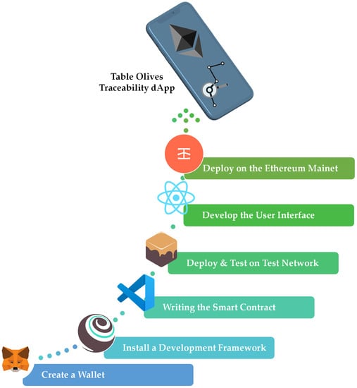 In today’s era, humanity has been overwhelmed by technological revolutions that have changed and will continue to change how business operations are performed, directly or indirectly. At the same time, the processes within the supply chain are quite complex, and as technology and processes evolve, they become more and more challenging. Traceability has become a critical issue in the food industry to ensure safety, quality, and compliance with regulations. The adoption of blockchain technology in the food supply chain has gained significant attention as a potential solution to improve traceability. This paper presents the development of a distributed application for table olives’ traceability on the Ethereum network. The paper also presents a methodological framework, which can help anyone aiming to implement an Ethereum decentralized application and demonstrates the practical use of the developed application by a Greek table olives producer. The application significantly improved the producer’s product traceability by providing a secure, transparent, and efficient solution for tracking and tracing the products in the supply chain. The app reduced the time, increased the accuracy and reliability of data, improved supply chain efficiency, and helped the producer comply with international regulations and standards.