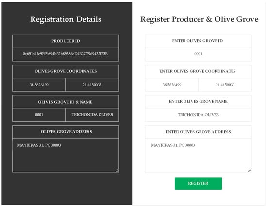 The application involves the use of codes on the packaging of table olives, which consumers can scan to obtain information about the olives’ origin, quality, production, distribution, and sales. For all the involved roles, it was necessary to create MetaMask wallets for making transactions through the dApp. This case study’s first step was registering the table olives producer and the olive grove. All necessary information is entered through the browser UI. More specifically, the entered information concerns the unique number that reflects the olive grove, the location in geolocation format, the name of the olive grove where the harvest took place, and its physical address. When we press the register button, the transaction dialog appears in the producer’s wallet in order to approve it and pay the corresponding price in Ethers. Then the registration must be approved by the administrator of the dApp, and afterward, the user is registered as a producer. After the registration is successful, the contents of Figure 3 are displayed. With the transaction’s approval, and after it has been executed successfully, all the information we entered for the olive grove and the producer’s unique identifier, which is nothing more than the address on the network, appears in the respective fields. In the present case, it is: “0x651b4fe9Ff5A94b32b89386eD4B3C7969432f73B”.