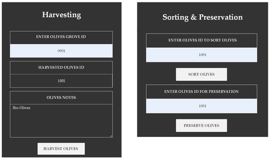 The next step is assigning all the process fields for the stages followed by the producer. Included are steps such as harvesting the olives from the olive trees, sorting the olives (which ones meet the criteria of the producer and which ones do not), and the maintenance in a container with brine and water for preservation purposes. A unique olives identifier is automatically generated after pressing the “Harvest Olives” button. Therefore, by assigning the unique identifier of the olives and pressing the corresponding button for each stage mentioned, the corresponding transaction is created in the network by removing the corresponding Ethers from the producer’s account. Additionally, for each process, a date and time stamp is recorded automatically by the application. The above screens are seen in Figure 4.