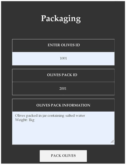 After assigning all the information about the harvesting, sorting, and preservation stages, the producer enters the unique identification (ID) code of the specific batch of olives given in a previous step (Olives Id) and enters the pack’s information. The app generates a unique code (Olive Pack Id) representing the bottling in a jar, can, or sack, as seen in Figure 5. Once again, the application automatically records a date and time stamp.