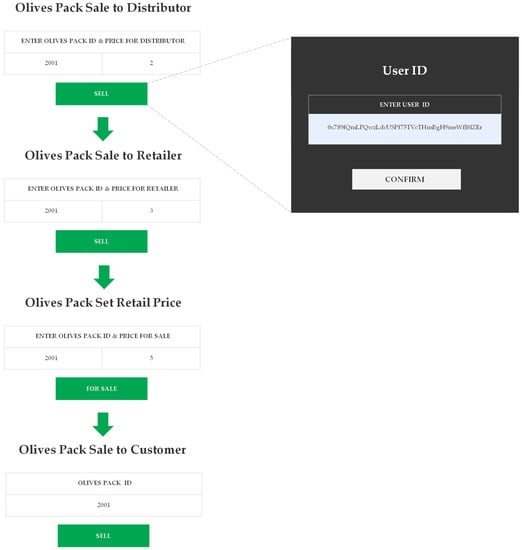 In the next step, as seen in Figure 6, the producer assigns the necessary fields in order to sell the packed olives to the distributor based on the unique pack code assigned in the previous step. After purchasing the pack, the distributor becomes the new owner of the product. Then, the distributor can, in turn, sell the corresponding pack of olives to the retailer, and the corresponding transaction can be processed in his wallet. After completing the previous step, the retailer becomes the new owner and can enter the product’s retail price for the consumer. Finally, the retailer can sell the corresponding pack of olives to the consumer, who becomes the final owner of the product. In all previous cases, the application records a date and time stamp when a transaction is performed. Moreover, when the olive packs are sold, a pop-up window opens requiring the seller to enter the buyer’s user ID.