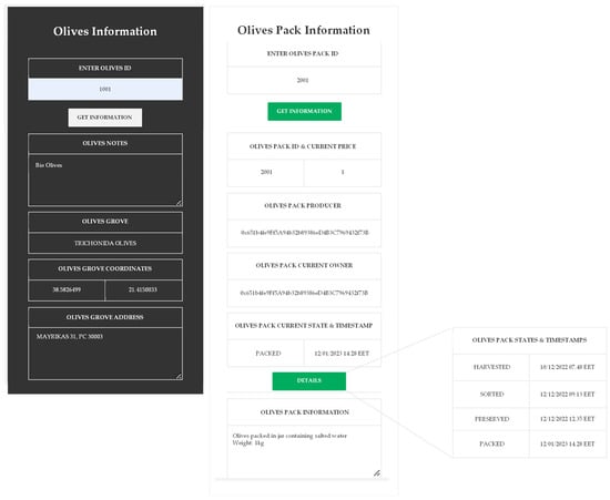 Finally, with the “Olives Information” and “Olives Pack Information” screens, seen in Figure 7, each interested user can gather information about both the olives and the final bottled product regardless of role. The information concerns the state of the product, for example, if it has been harvested, sorted, packed, sold, etc., and the addresses of the producer and current owner. Access to the information is given by entering the pack’s ID. Moreover, by entering the Olives ID, more information can be given about the origin of the olives. For example, in Figure 7, the pack with ID “2001” has been successfully packaged but not yet sold to a distributor. By clicking on the “Details” button, the user can see the complete history of state changes.
