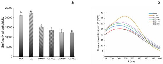 Surface hydrophobicity (a) and intrinsic tryptophan fluorescence (b) on MPs treated with various concentrations of FOs (0, 50, 100, 150, and 200 µmol/g protein) under nonoxidizing (NOX) or oxidizing (OX) conditions. Different lowercase letters represent significant differences between samples (p < 0.05).