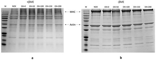SDS-PAGE patterns of MPs oxidatively stressed in the absence of FOs at different concentrations (0, 50, 100, 150, and 200 µmol/g protein). Samples were prepared in the presence ((a), +βMe) or absence of β-mercaptoethanol ((b), −βMe). M, marker; NOX, nonoxidized; OX, oxidized; OX + 0, OX + 50, OX + 100, OX + 150, and OX + 200: oxidized in the presence of FOs at 0, 50, 100, 150, and 200 µmol/g protein, respectively.