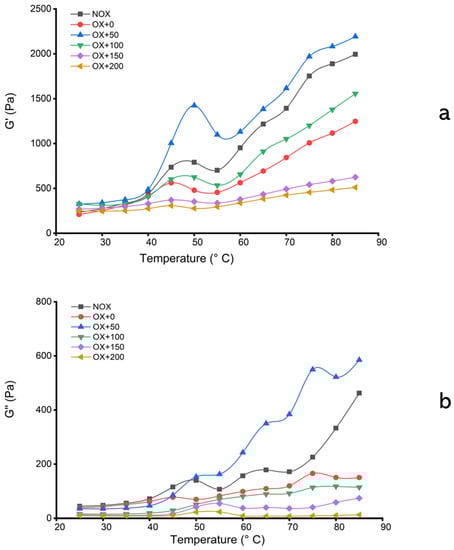 G’ (a) and G” (b) of MP solutions during gelation (25–85 °C) affected by oxidative stress with or without FOs. NOX, nonoxidized; OX, oxidized; OX + 0, OX + 50, OX + 100, OX + 150, and OX + 200: oxidized in the presence of FOs at 0, 50, 100, 150, and 200 µmol/g protein, respectively.