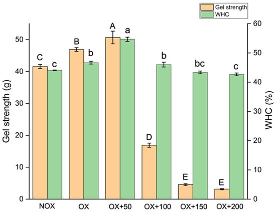 Gel strength and water-holding capacity (WHC) of MP gel treated with various concentrations of FOs (0, 50, 100, 150, and 200 µmol/g protein) under nonoxidizing (NOX) or oxidizing (OX) conditions. Lowercase and uppercase letters represent significant differences in the WHC and gel strength indices between samples (p < 0.05).