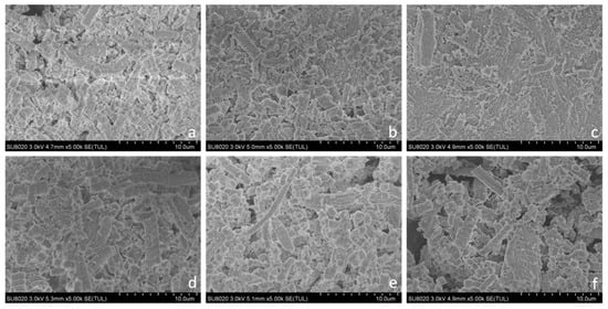 SEM photographs (5000×) of MP gels oxidatively stressed in the presence and absence of FOs at different concentrations: (a) NOX, nonoxidized; (b) 0; (c) 50 μmol/g FOs; (d) 100 μmol/g FOs; (e) 150 μmol/g FOs; and (f) 200 μmol/g FOs.