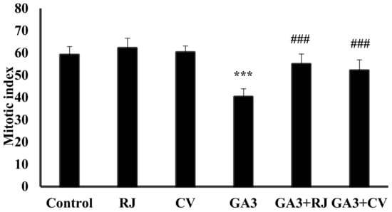 Effect of RJ and CV on the mitotic index of control and GA3-induced rats. The mitotic index was obtained by counting 6000 mitotic cells per treatment. Data are expressed as Mean ± SD (N = 6). *** p ≤ 0.001 vs. Control, ### p ≤ 0.001 vs. GA3.