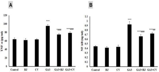 The anti-inflammatory effect of RJ and CV against GA3- triggered inflammation was assessed by measuring TNF-α (Figure 2A) and NF-κB (Figure 2B) serum levels. Circulating levels of TNF-α were markedly (p ≤ 0.001) increased in the GA3-administered group as compared to the control group. RJ or CV supplementation revealed a significant (p ≤ 0.001) reduction in serum levels of TNF-α compared with the GA3-administered group. Likewise, the GA3-administered group showed a significantly (p ≤ 0.001) elevated NF-κB level, an effect that was significantly reduced after the administration of RJ (p ≤ 0.001) or CV (p ≤ 0.01).