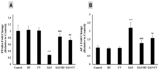 Effect of RJ and CV on gene expression level of PPARα (A) and AP-1 (B) in liver of control and GA3- induced rats. PPARα: Peroxisome proliferator activated receptor α; AP-1: activator protein 1. * p ≤ 0.05, *** p ≤ 0.001 vs. Control. # p ≤ 0.05, ## p ≤ 0.01, ### p ≤ 0.001 vs. GA3.