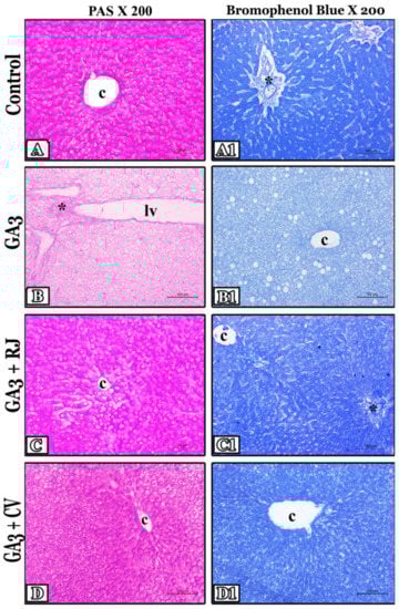 Data represented in Table 3 revealed that the GA3-induced group had significantly (p ≤ 0.001) higher levels of ALT, AST, ALP, γGT, and total bilirubin, as well as significantly (p ≤ 0.001) lower levels of albumin. Rats that received RJ and CV simultaneously with GA3 showed a significant (p ≤ 0.001) amelioration of ALT, AST, ALP, γGT, and total bilirubin. Albumin was meaningfully raised in RJ (p ≤ 0.001) and CV (p ≤ 0.01) treated groups compared to GA3 intoxicated rats.