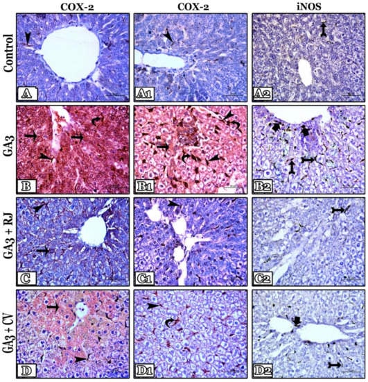 3.3. RJ and CV Alleviate Hepatic Oxidative Stress Induced by GA3 in Rats