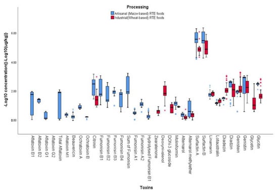 - Adekoya, I.; Njobeh, P.; Obadina, A.; Chilaka, C.; Okoth, S.; de Boevre, M.; de Saeger, S. Awareness and prevalence of mycotoxin contamination in selected Nigerian fermented foods. Toxins 2017, 9, 363. [Google Scholar] [CrossRef]