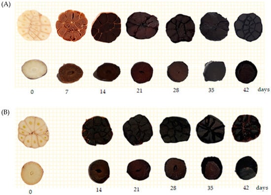 For heat treatment, the moisture content of Thai garlic cultivated from January to March was 67.30–68.14%, whereas that of Chinese garlic was 58.04–58.63%. During method A, the water evaporation rates until day 41 were 58.26 and 56.25% in Thai and Chinese garlic samples, respectively, and the moisture contents of Thai and Chinese fresh garlic samples in method B were 14.22 and 15.39%, respectively. At the end of the aging process on day 42, the moisture contents of both BGs from method B were lower than those of method A. Changes in the color of the Thai and Chinese garlic samples during methods A and B are shown in Figure 1.