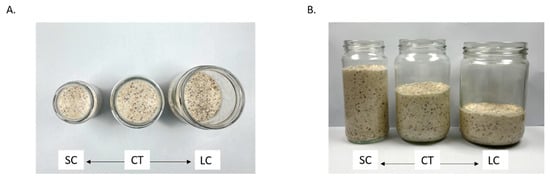 Demonstration of the top view (A) and the side view (B) of the jar sizes used in the study. Small jar size condition (SC) was 5.7 cm in diameter (volume = 9.9 oz), medium jar size condition (control, CT) was 7.3 cm in diameter (volume = 16.3 oz), and large jar size condition (LC) was 8.9 cm in diameter (volume = 24.2 oz). The three jars displayed in the figure contained 226 g of oat pudding—a portion averaged across all participants.