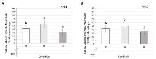 Effect of the jar size condition (CT, SC, LC) on Satiety Labelled Intensity Magnitude (SLIM) scale ratings based on 61 (panel (A)) or 40 participants (panel (B)). Error bars represent standard deviations. Assigned letters in the figure indicate significant differences (p < 0.05) across the conditions.