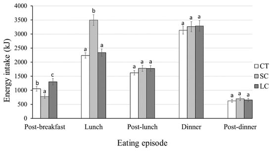 Bar charts illustrating the downstream energy intake across jar size conditions (CT, SC, LC) at post-breakfast, lunch, post-lunch, dinner, and post-dinner eating episodes for N = 40 participants. Data are reported as mean ± standard error. Assigned letters in the figure indicate significant differences across the conditions at each eating episode (p < 0.05).