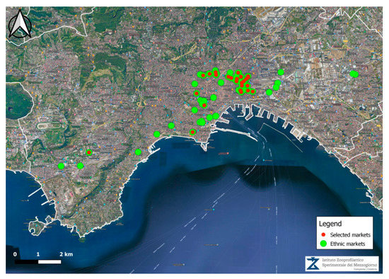 Samples were bought at local ethnic food retail outlets in the Neapolitan area, in the Campania region, by the local veterinary services of Napoli 1 Centro. All of these outlets were registered on GISA (Integrated Management of Services and Activities), a system developed by the Campania Region, which records various information on food retailers, such as the type of food products and the geographic position of the retail outlet. The above ethnic market consists of shops selling ethnic products, in accordance with the European Regulation (EC) No 852/2004. From the list of 72 ethnic food outlets, 25 were selected by means of a simple random sampling technique without repetition. Their geographic positions (Figure 1) were plotted by the Osservatorio Regionale Sicurezza Alimentare (ORSA) of the Istituto Zooprofilattico Sperimentale del Mezzogiorno by means of the software QGIS 3.22 (http://qgis.osgeo.org accessed on 22 October 2021).