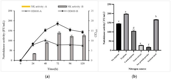 First, PSP2 was inoculated into the culture medium using oyster protein hydrolysate as the sole nitrogen source, and the enzymatic activity of nattokinase and optical density at 600 nm (OD600) were determined. As shown in Figure 1a, OD600 increased rapidly during the first 24 h of fermentation, indicating that the bacteria proliferated rapidly. However, the rapid growth of PSP2 was only observed for a short period when oyster protein hydrolysate was used as the sole nitrogen source, indicating that the strain could not effectively utilize oyster protein hydrolysate to produce nattokinase. In the LB medium, PSP2 showed improved growth and produced nattokinase. Since PSP2 did not produce nattokinase in a medium that only uses oyster protein hydrolysate as a nitrogen source, additional nitrogen sources are added to promote the production of nattokinase. Based on the growth characteristics of B. subtilis, soybean peptone, pancreatic peptone, casein peptone, yeast extract, soybean protein powder, and soybean meal powder were optimized as exogenous nitrogen sources. As shown in Figure 1b, a medium containing 1.0% oyster protein hydrolysate combined with 1.0% exogenous nitrogen promoted the growth and metabolism of PSP2 and the production of Nattokinase. The nitrogen sources for the maximum enzyme activity of nattokinase produced by PSP2 were tryptone > soybean meal > soybean peptone > casein peptone > yeast extract > soybean protein powder. These results revealed that tryptone promoted rapid growth and increased enzyme production by the PSP2 strain.
