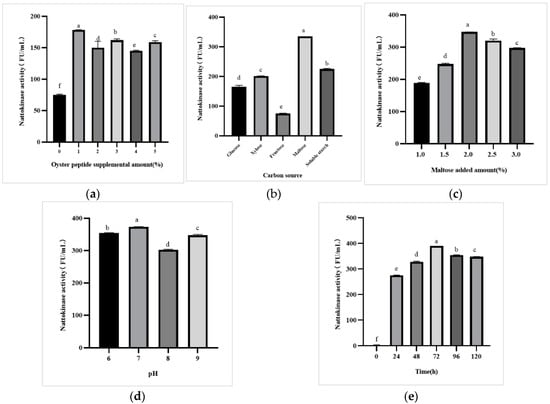 Effects of fermentation conditions on the production of nattokinase. (a) Nattokinase activity of PSP2 in media with different oyster protein hydrolysate additions. (b) Nattokinase activity of PSP2 in media with different carbon sources. (c) Nattokinase activity of PSP2 in media with different maltose additions. (d) Nattokinase activity of PSP2 in media with different initial pH. (e) Effect of fermentation time on the production of nattokinase by PSP2 (p < 0.05). Different lowercase letters in the figure indicate significant differences between values.
