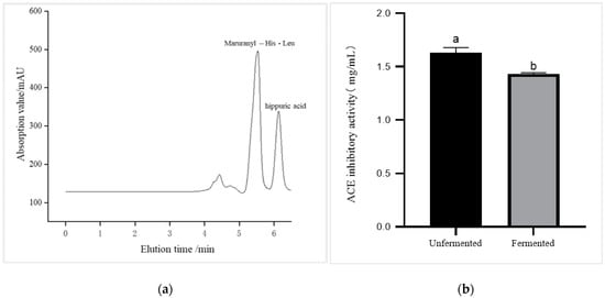 (a) HPLC diagram for assay of ACE inhibition activity. (b) Results of ACE inhibition activity in oyster fermentation liquid (p < 0.05). Different lowercase letters in the figure indicate significant differences between values.