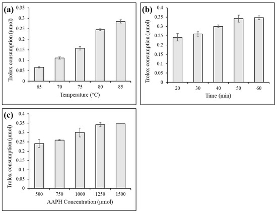 AAPH radicals were generated under heating conditions. In this study, we investigated the effects of water bath temperature (65, 70, 75, 80, 85 °C), heating time (20, 30, 40, 50, 60 min), and concentration of AAPH (500, 750, 1000, 1250, and 1500 µmol in PBS; pH = 7.4) on the production of AAPH radicals using a single factor experiment, and the consumption of Trolox was used as a quantitative standard. While investigating other factors, this study used 75 °C, 30 min, and 500 µmol to control for variables. Trolox content was quantified using a standard curve (50–500 µmol) and detected at 291 nm using a UV spectrophotometer (UV1601, SHIMADZU, Kyoto, Japan) [15].