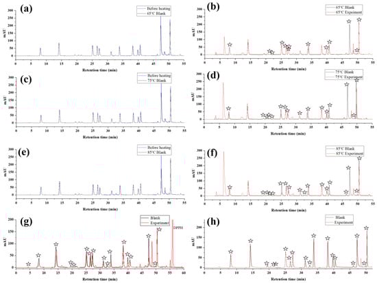 Thermal stability of polyphenols at different temperatures (a,c,e) and results of screening antioxidants based on AAPH radicals (b,d,f), DPPH radicals (g) and ABTS radicals (h) from mixed polyphenols. The pentagram in figure represents a peak reduction of the compound based on a reaction with radicals.