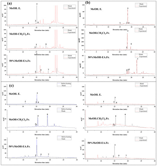 Briefly, 150 µL of DPPH solution (2.5 mg/mL in methanol) and 50 µL of the mixed standard solution (320 µmol in methanol) or extract (1 mg/mL in methanol) were mixed and incubated for 30 min at 37 °C. Therefore, the reaction solution, with an injection volume of 10 µL, was analyzed by HPLC. As a control, the DPPH solution was replaced with methanol when incubating with the mixed standards or extract to form a DPPH free group. Compared to the DPPH free group, compounds with reduced peak areas in the DPPH group were assigned as having potential antioxidant activity [16]. Peak area reduction by DPPH radicals was calculated using the following Formula (4):
