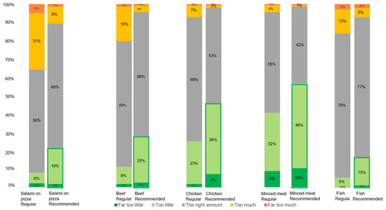 In Figure 3, it can be observed that the perceived amount of meat varied not only between regular and recommended portion sizes but also among the types of meal. For instance, the recommended portion of minced meat was more often perceived to be “too little” than the recommended portion of fish. Moreover, the recommended portion of salami was more often perceived to be “too much” than the recommended portion of minced meat.